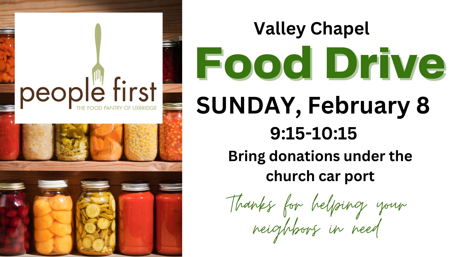 Bring your non perishable donations to the East Side (children's side) card port and put your donations in the church van. Everything collected will be brought to the Uxbride Food Pantry.