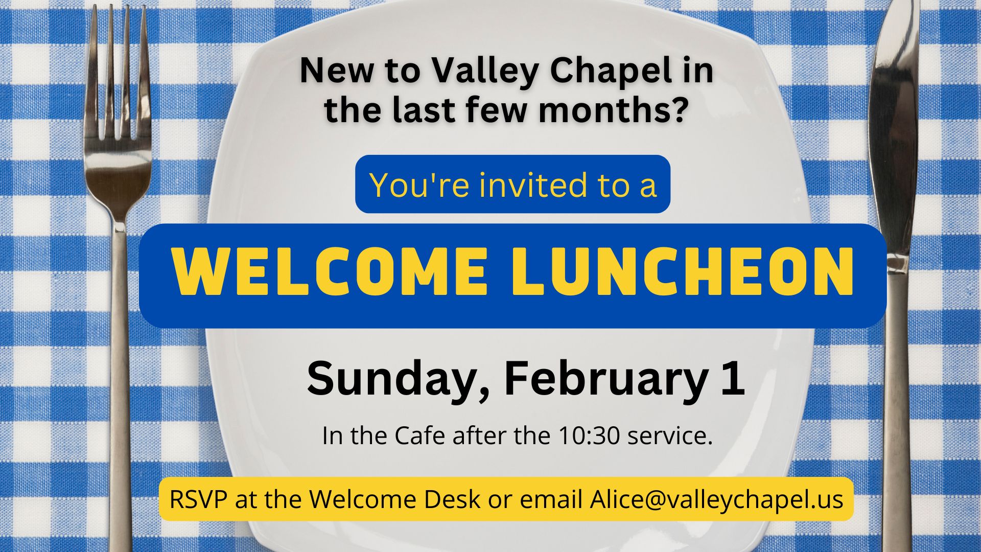 If you are new to Valley Chapel and have not experienced our Welcome Luncheon, we would love for you to join us after church next Sunday in the Cafe and get to know us a little better.